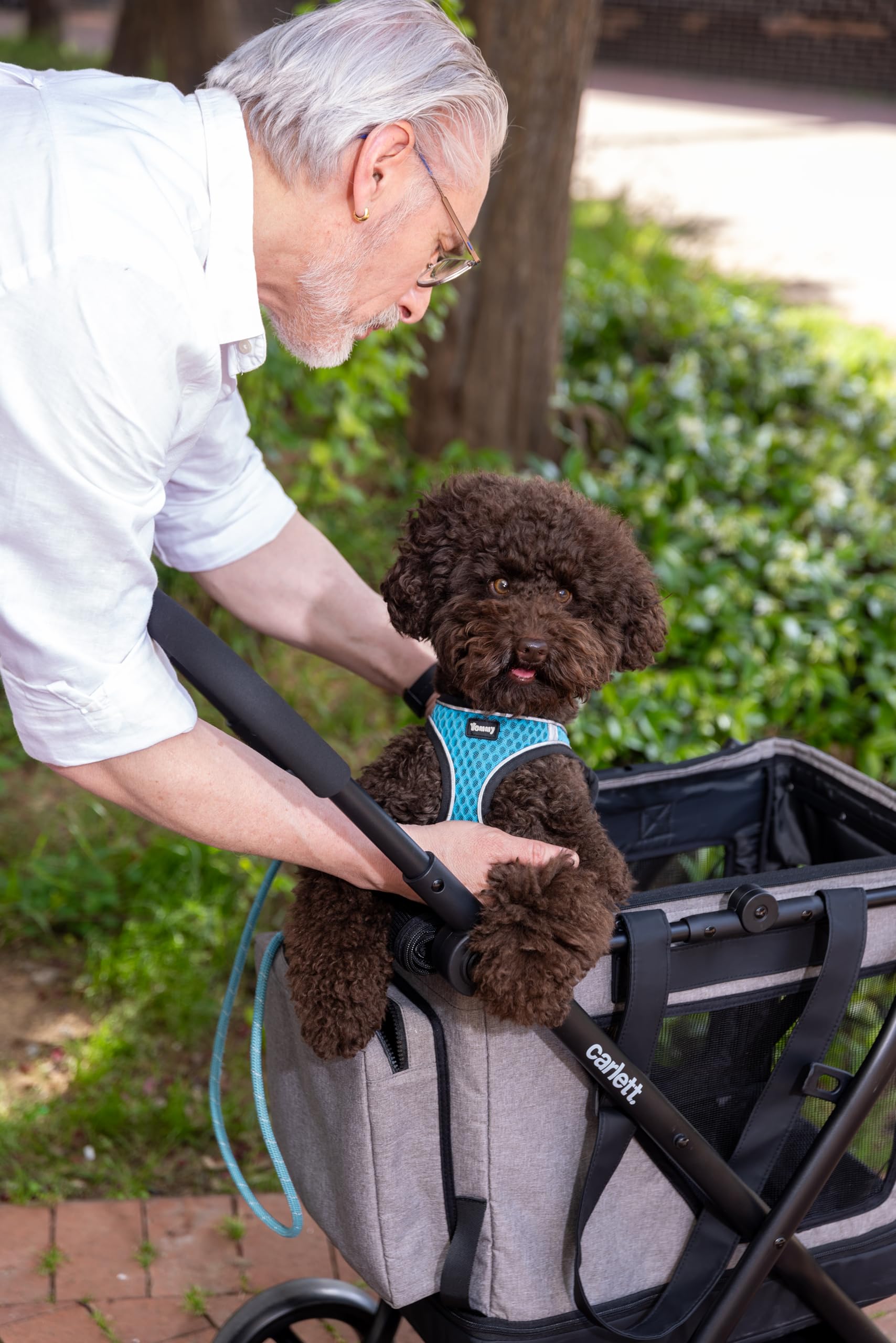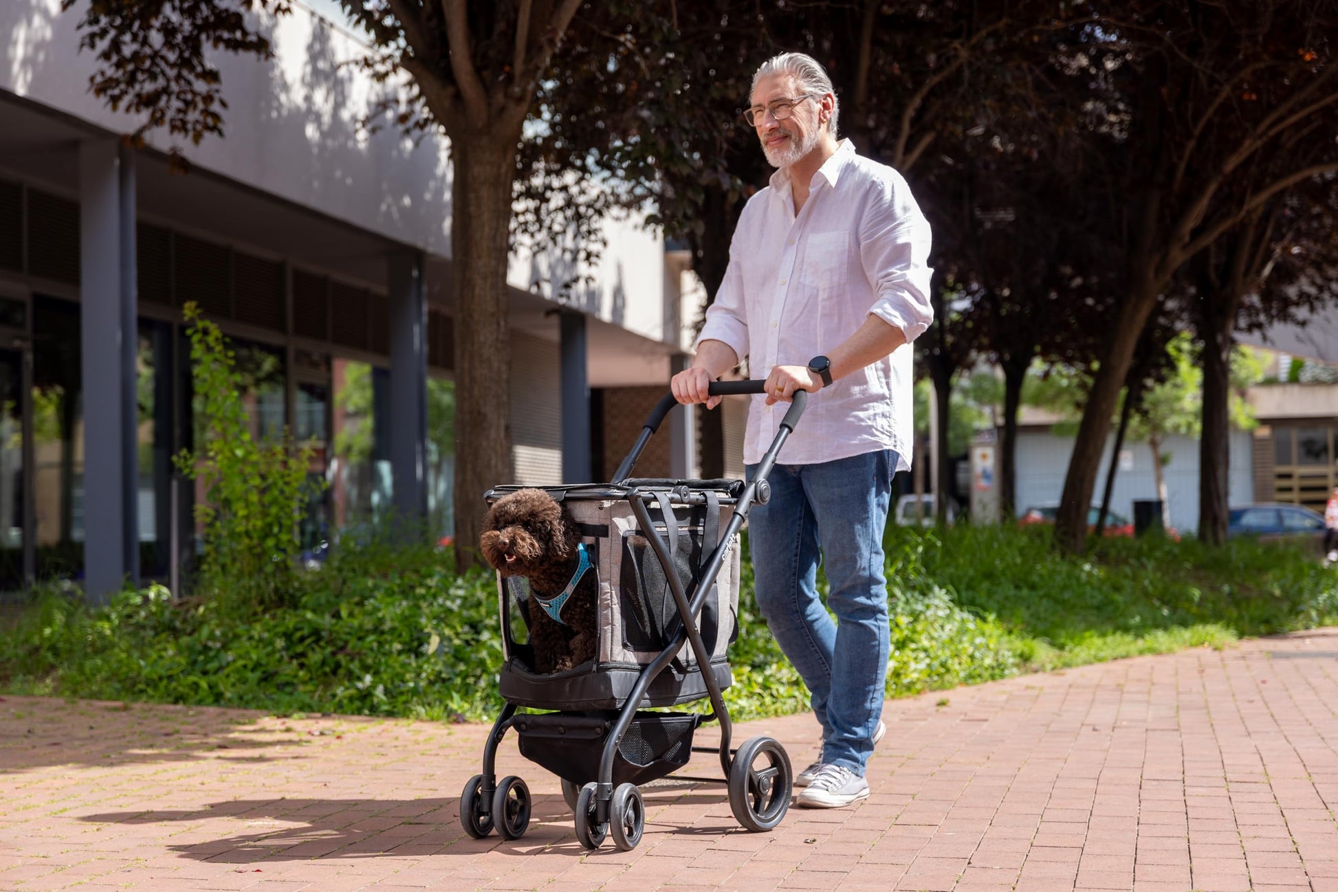 Dieses Modell ermöglicht den Austausch der Haustiertasche gegen eine Einkaufstasche (separat erhältlich). Zusätzlich verfügt es über eine herausnehmbare untere Ablage, die die Reinigung vereinfacht – eine einzigartige Funktion, die den Wagen noch funktionaler macht. Eine Struktur, zwei Anwendungen: Spaziergänge oder Einkaufen.